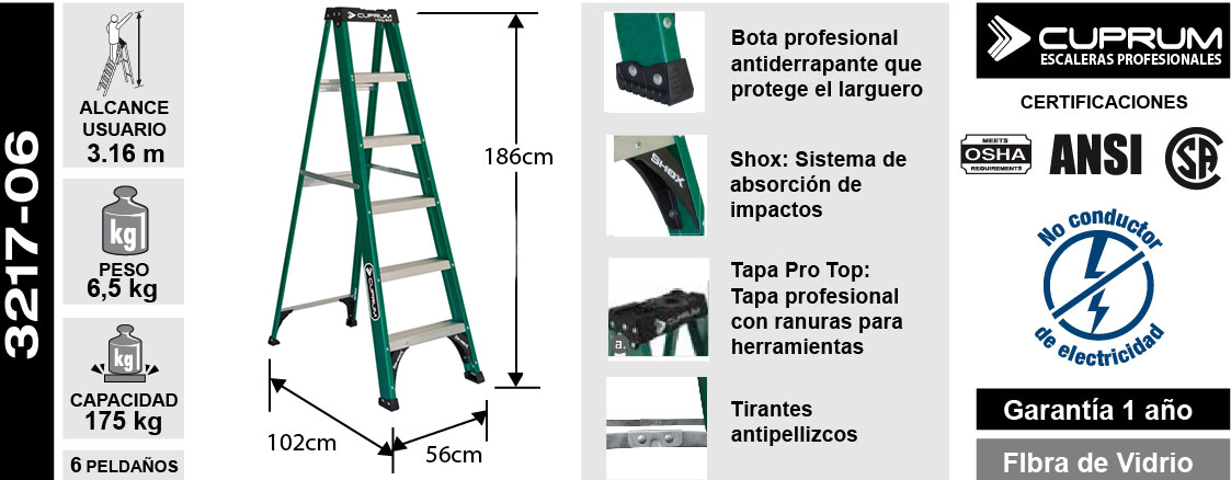 Escalera Tijera Fibra de Vidrio 1.86M / 6P / 175KG