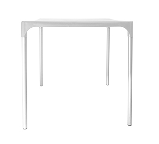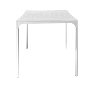 - Mesa con cubierta plástica y patas de aluminio de alta resistencia y durabilidad.