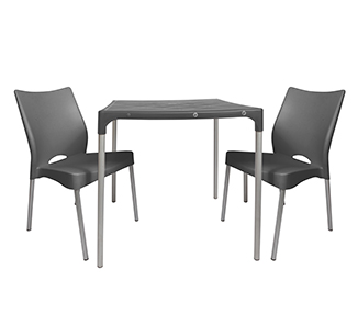 - Mesa con cubierta plástica y patas de aluminio de alta resistencia y durabilidad.